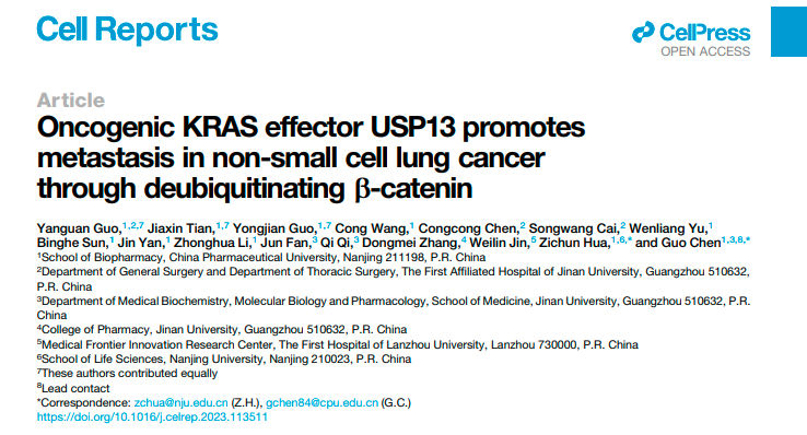 麻豆社 陈果教授课题组在Cell Reports期刊上发表了题为Oncogenic KRAS effector USP13 promotes metastasis in non-small cell lung cancer through deubiquitinating β-Catenin的文章。该研究发现KRAS激活上调去泛素化酶USP13,是KRAS突变肿瘤的一个新的下游效应蛋白。USP13促进肺癌细胞转移,其高表达与肺癌患者不良预后高度相关。