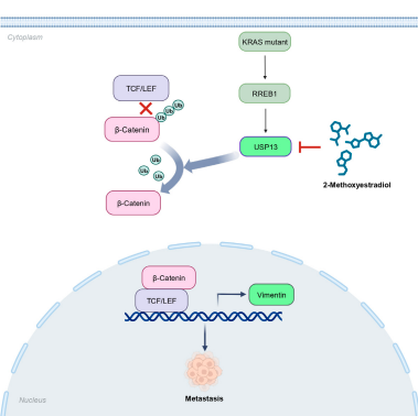 该研究鉴定USP13是治疗转移性KRAS突变肿瘤的潜在药物靶点。并且,筛选发现了一个天然小分子药物2-Methoxyestradiol能够直接抑制USP13活性,为通过靶向USP13治疗KRAS突变肿瘤的转移提供了一个先导化合物,具有临床转化潜力。将为KRAS突变肿瘤的精准治疗提供了一个新的科学依据。麻豆社 博士生田家欣为该论文的共同第一作者。